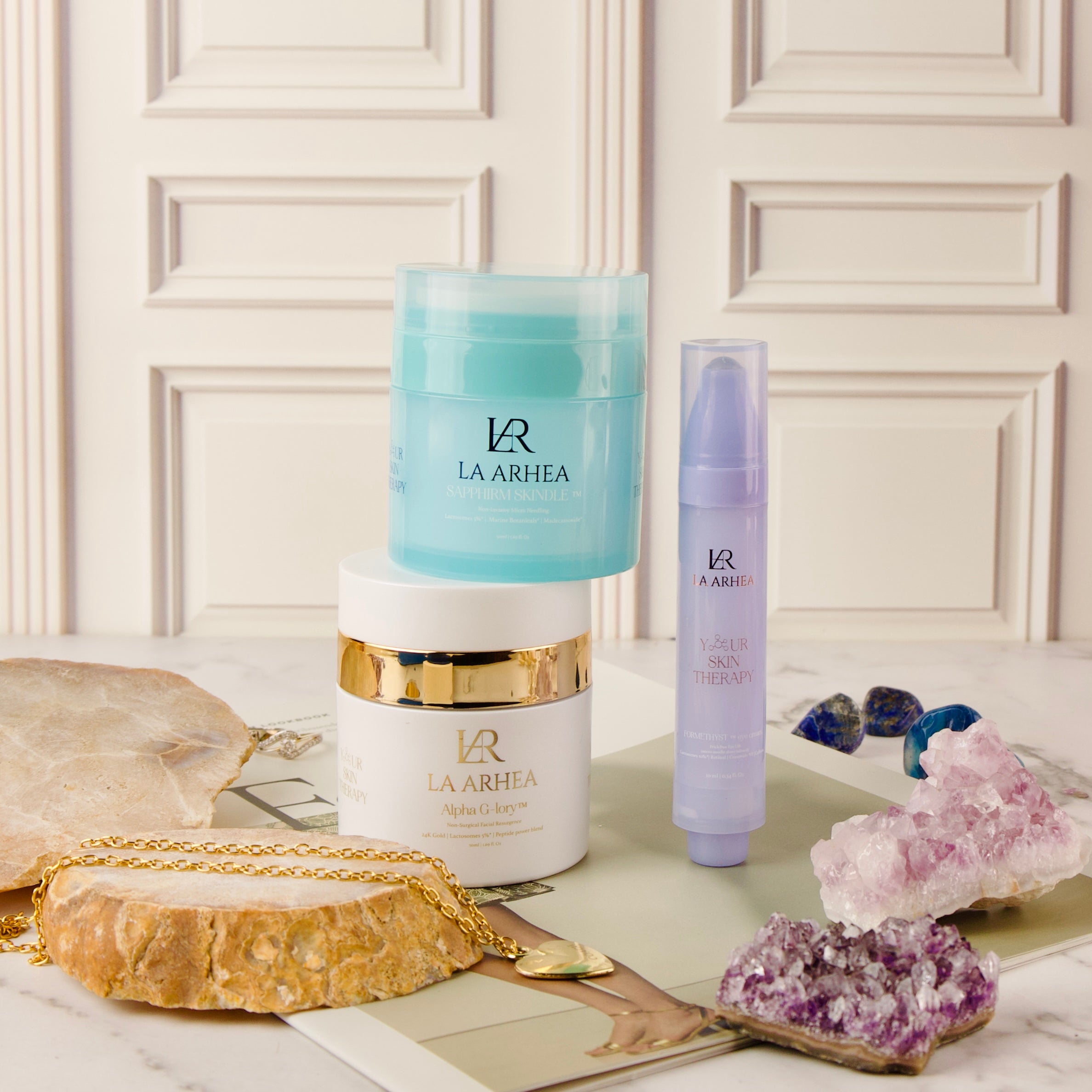 From oligotherapy (micro-dosed minerals that rebalance and repair skin) to gemstone-infused formulas, La Arhea blends earth’s elements with clinical science. Ferments, marine botanicals, and next-gen actives work together to hydrate deeply, strengthen the skin barrier, and deliver visible results—luxurious, intentional, and undeniably effective.